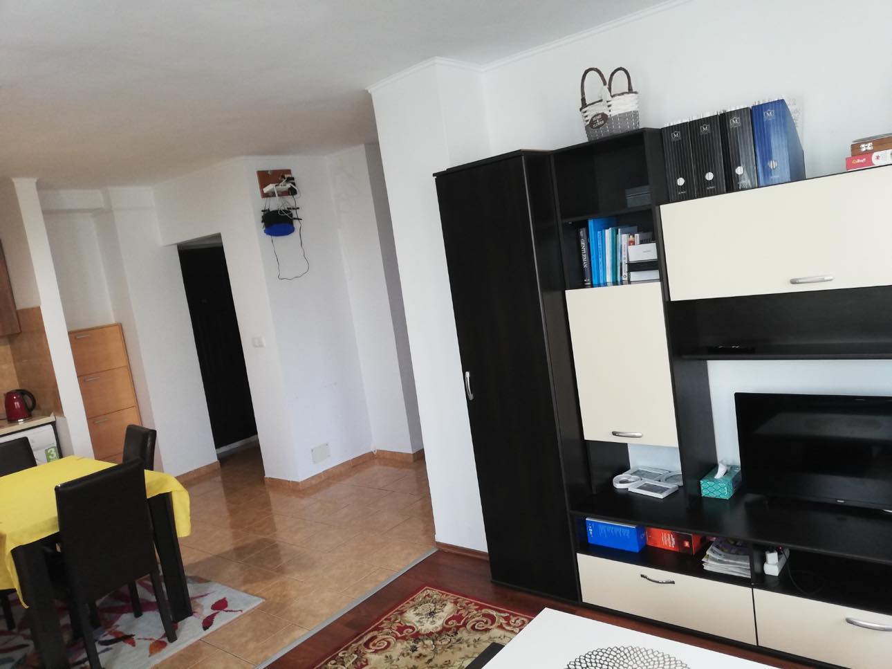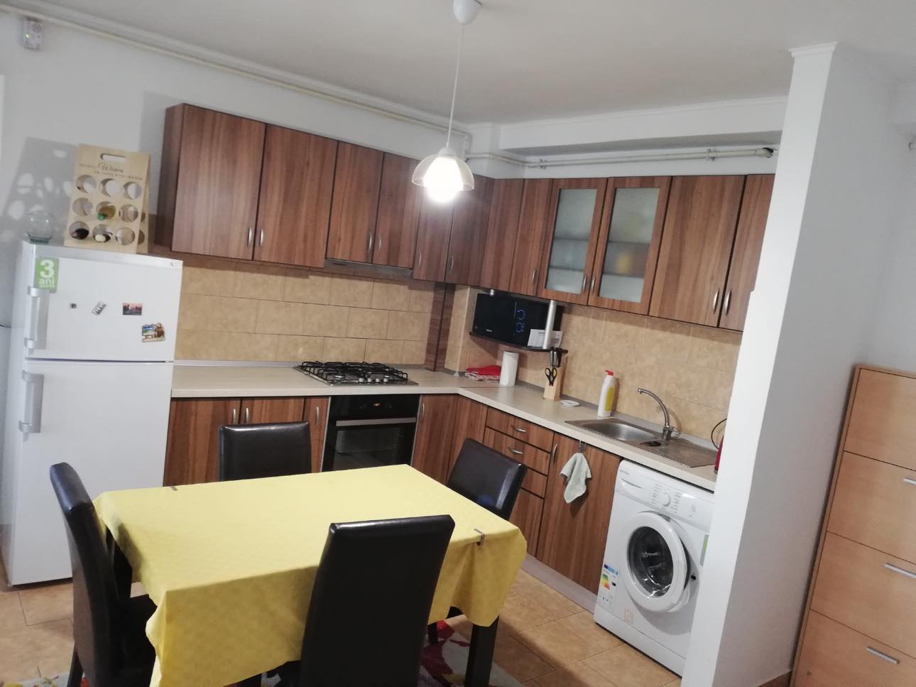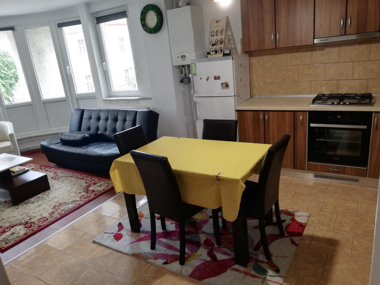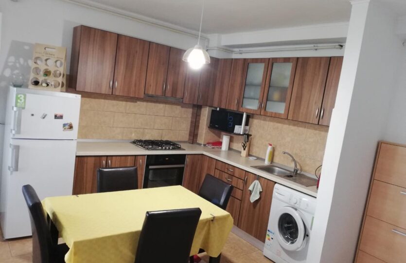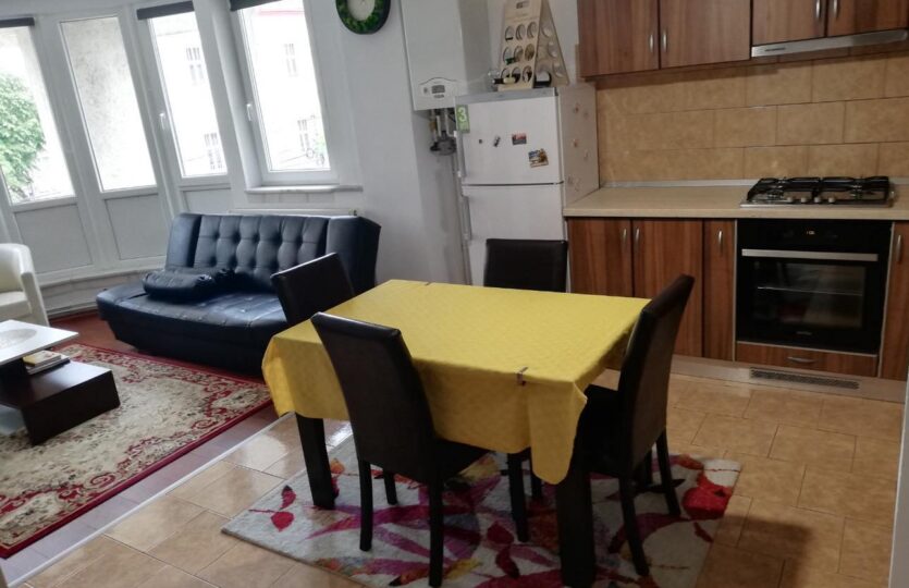 Apartament 3 Camere Central decomandat, parchet laminat, gresie, faianta, geamuri termopan, compus din 2 camere+living cu bucatarie open space, balcon, baie, hol, mobilat, utilat, et.2/7, lift, bloc de caramida, usa metalia, 62 Mp.